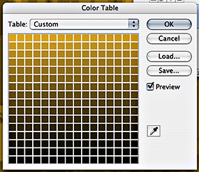 I selected all 256 squares (grayscale tonal values) by running the cursor over them from top to bottom. Making this selection causes the Color Picker window to open, and I was prompted to select my “first color.” (The idea here: pick a first and last color and thereby define a range of 256 colors between those two values. These new color values will replace the original grayscale values.)