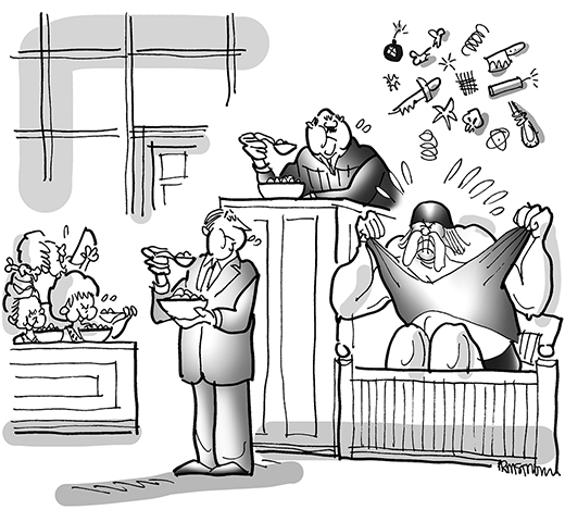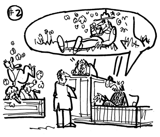 I do a “strange suit” cartoon every month for Inside Counsel Magazine. The latest features wrestler Hulk Hogan who’s suing Cocoa Pebbles cereal for a “degrading” ad in which the Flintstones character Bamm-Bamm beats up a character who looks like Hulk. Scroll down to see the sketches for the other lawsuits.