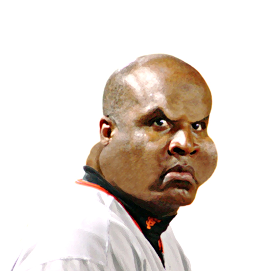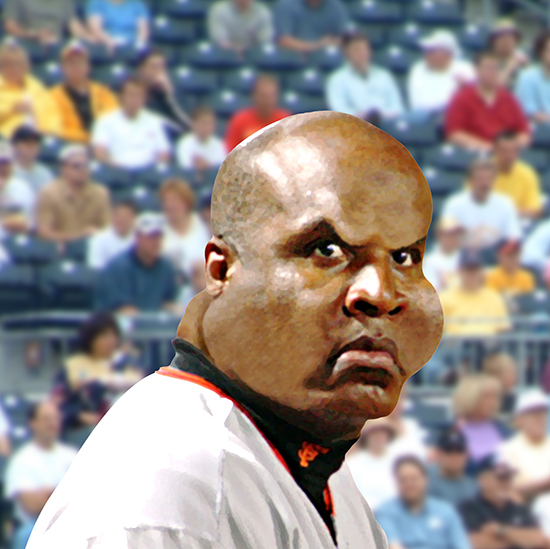 A caricature of baseball player Barry Bonds created entirely in Photoshop. Scroll