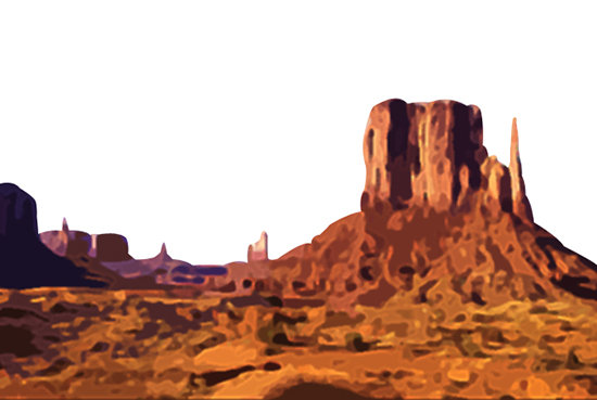 I used Photoshop to clean up the original line drawing, and a photo of Arizona’s Monument Valley for the background. I retained the photo’s original RGB color mode so I could apply Photoshop’s Artistic Filters (which are not available for CMYK images). The filters smooth the contours of the photo, making it easy to use the Pen Tool to clip out the remaining clouds. I converted the photo to CMYK before pasting it into the illustration, then used a watercolor brush to add some blue sky. Scroll down to see the entire construction sequence.