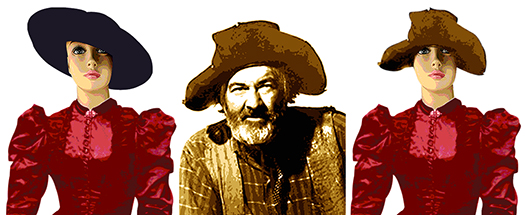 A more pronounced absurdist element was needed. I hit on the idea of replacing the mannequin’s stylish hat with a colorized and posterized copy of Gabby Hayes’ famous topper. This clearly struck the right tone…use Photoshop Pen tool to clip out Gabby Hayes hat and put on fashion mannekin