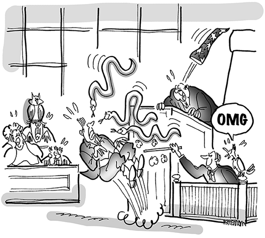 Here’s the finished cartoon. Scroll down to see the other rough sketches.  lawsuit involving Adorian Deck and Emerson Spartz and intellectual property rights relating to a Twitter account called OMG Facts