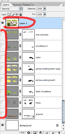 I selected Edit > Copy Merged, which copied all the visible layers in my document. I then clicked on the topmost of the eight shrubbery layers, and selected Edit > Paste, which pasted in the Copy Merged layer above the topmost shrubbery layer (the pasted-in layer is Layer 1 in the Layers Window below). I then “clicked on the eye” in all eight shrubbery layers, making them invisible.