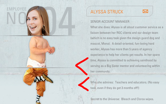By contrast, consider the About card for RG team member Alyssa below. It doesn’t just say she’s a Big Sister and a volunteer. It says she’s committed to achieving sainthood by being a Big Sister and volunteer. That made me roar with laughter, and created a wonderful impression. Good works are impressive, but they can sometimes be a little daunting. Good works and self-mockery are virtually irresistible.  Employee about info from Rusty George Creative website with funny mixed up head and body and short bio saying she tries to be a saint by doing volunteer work