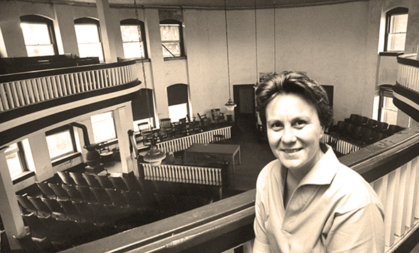 photo of To Kill A Mockingbird author Harper Lee sitting in balcony of Monroe County Courthouse in Monroeville, Alabama where her trial lawyer father had argued cases