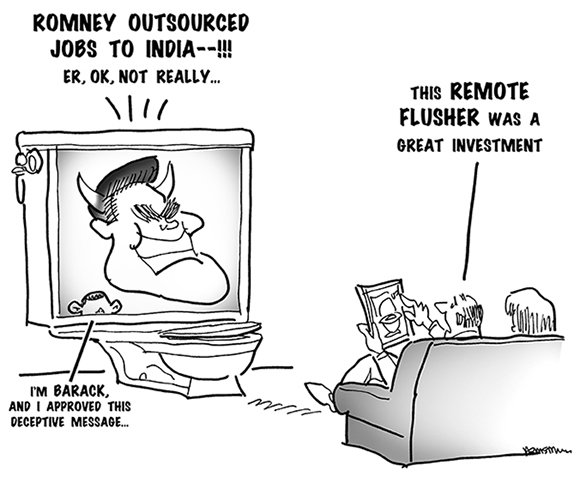 political cartoon about obama television campaign commercial which claims mitt romney outsourced jobs to India when he was governor of Massachusetts, guy on couch has remote flusher to put ad in toilet
