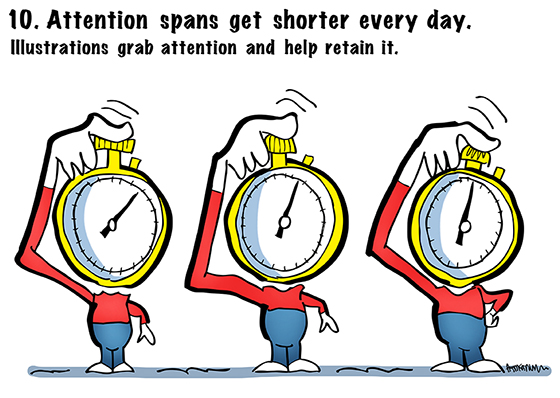 People click past a solid block of text. They also click past clip art or stock photos, because they know instinctively that they’re looking at filler. But they’ll stop for an amusing custom illustration– and there’s a good chance they’ll stay long enough to read some of the text that goes with it.