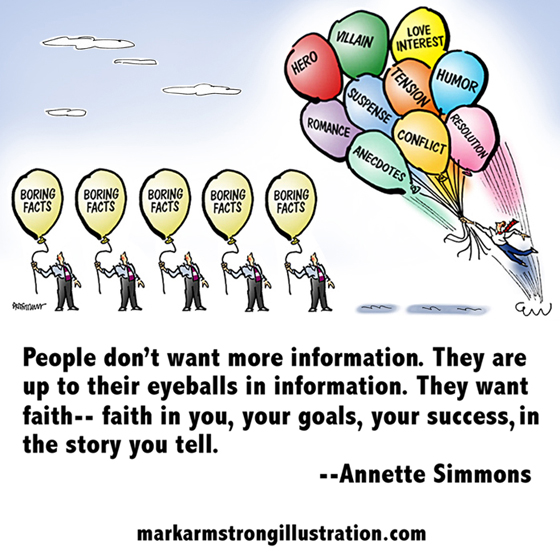 The above is a good example of how images can be recycled, which makes them a good investment. I’d previously used this “balloon image” for a post called 10 Storytelling Essentials. By including the URL for my website, I insure that my brand gets promoted whenever someone shares the illustrated quote.![]()