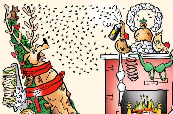 Turns out the beautiful Frazier fir had a hidden insect nest. Then three mustachioed hens wearing berets showed up. There was a guy in a smelly reindeer suit, a sack of prunes for Aunt Plushbottom, and some Alabama carolers who insisted on singing Free Bird instead of White Christmas.
