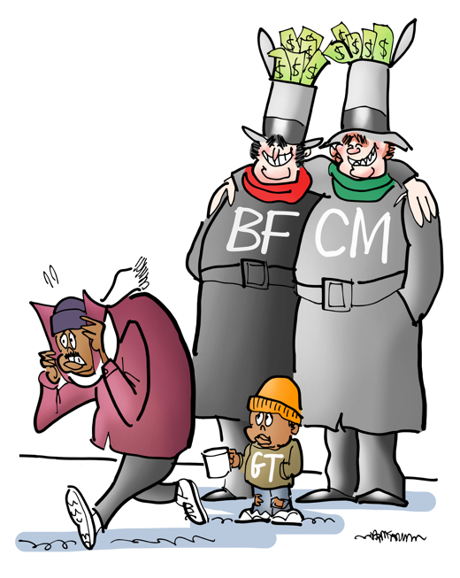 Giving Tuesday poor kid begging on street guy hurries past can't give because he spent all his money on Black Friday Cyber Monday Scrooge types with money stuffed in tophats