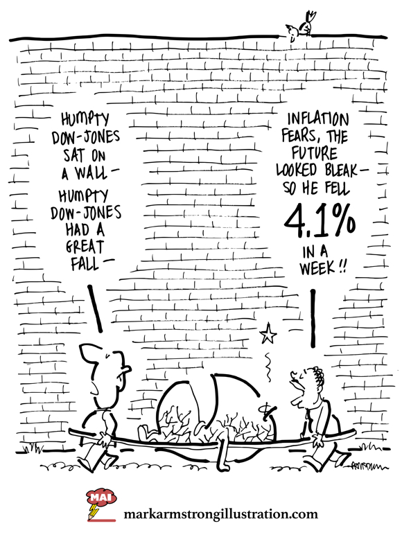 Investors, hold onto your hats.Humpty Dumpty nursery rhyme satire cartoon Dow Jones had a great fall 4.1% February 2018 cracked egg being carried off on a stretcherblank vertical space, 16 pixels high