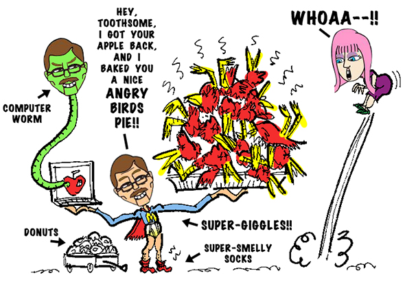 Super Mac Giggles rescues Toothsome's Apple computer and bakes her an Angry Birds Pie