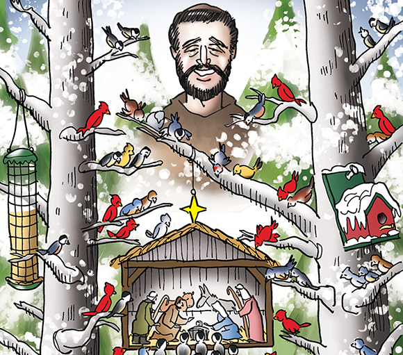 A 2012 Christmas cover illustration for the Inland Register, the monthly news magazine for the Roman Catholic Diocese of Spokane, Washington, USA. That’s Francis of Assisi, patron saint of animals and the environment, smiling in the background.
